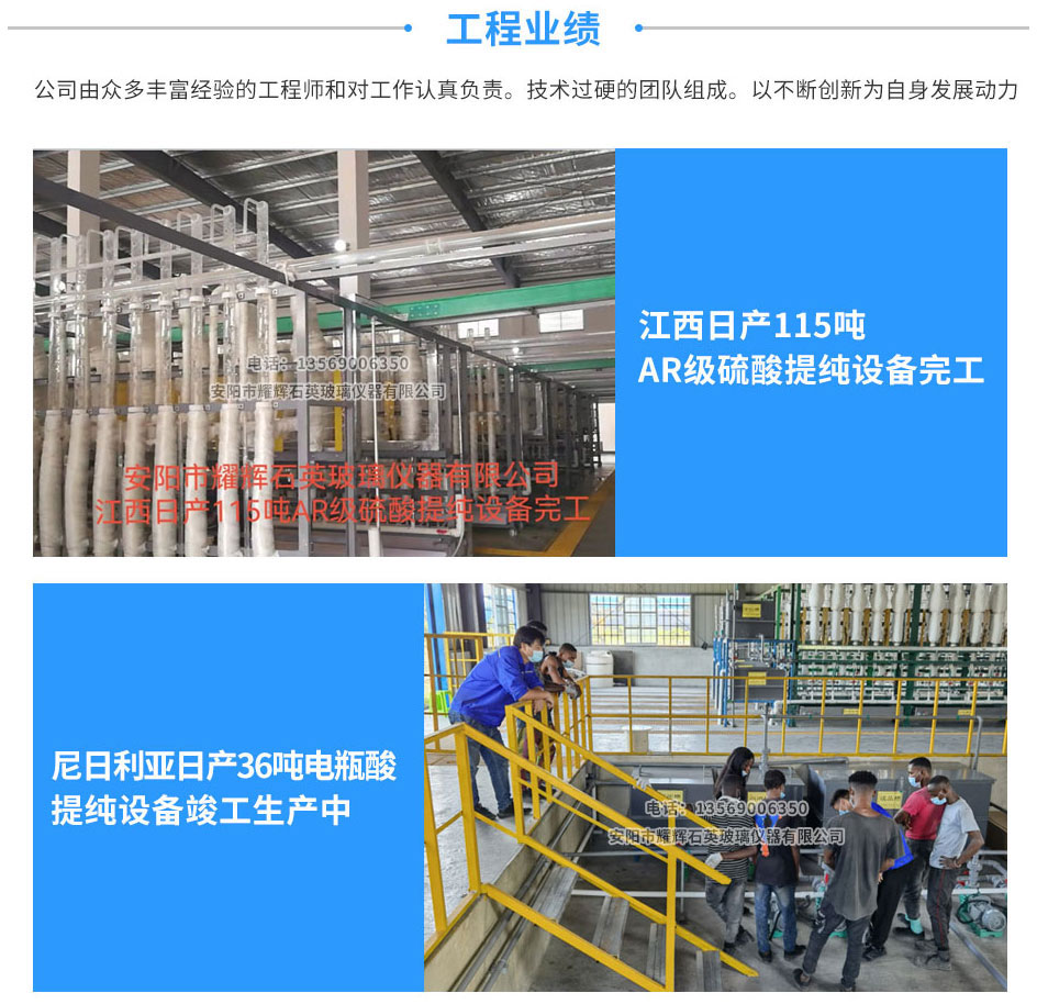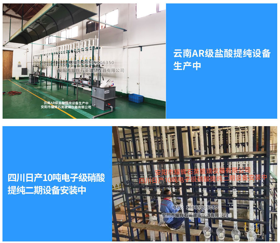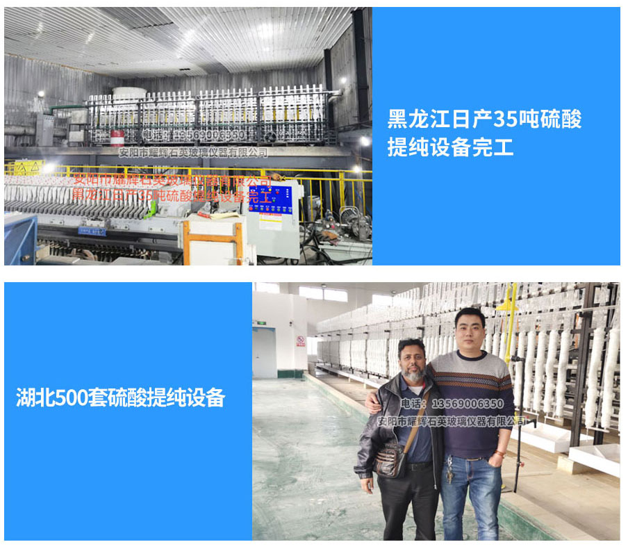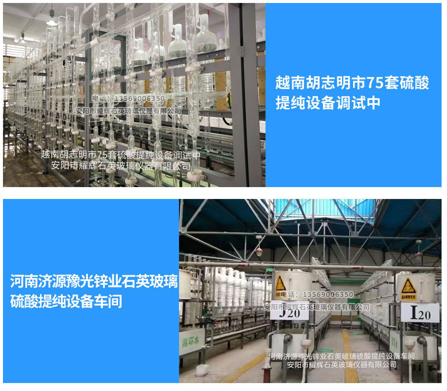 安阳市耀辉石英玻璃仪器有限公司生产提供石英玻璃提纯设备、硫酸提纯专用设备、盐酸提纯设备、硝酸提纯设备和部分有机产品提纯设备。产品分别有电加热、天然气加热硫酸、盐酸、硝酸等试剂提纯设备,设备广泛用于化工、医药、电子、煤炭、冶金、铅酸蓄电池等行业。